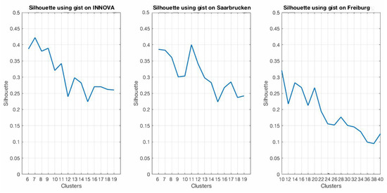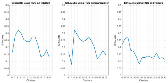 Figure 11 shows the average silhouette when the HOG descriptor is used. This figure shows that the average silhouette decreases when the number of clusters continuously increases. The results obtained with the INNOVA dataset show that the silhouette is between 0.1 and 0.3; in particular if we observe the result with 6 clusters (which lead to the maximum silhouette with the proposed method) silhouette is 0.13 while with the proposed method is 0.3973. In the case of the Saarbrücken dataset, while the silhouette obtained with batch spectral clustering is between 0.1 and 0.3, the results with proposed incremental method are between −0.4 and 0.3. Observing the result with 16 clusters (which led to the best silhouette with the proposed method) we note this is about 0.15 as opposed to 0.2756 with the proposed algorithm. Finally, regarding the Freiburg dataset, while the results using batch spectral clustering are between 0.1 and 0.25, results using the incremental method are among −0.5 and −0.15. The maximum value of silhouette of the proposed method is equal to −0.1526 with 30 clusters, while the batch clustering method provides a silhouette of 0.13 with the same number of clusters.