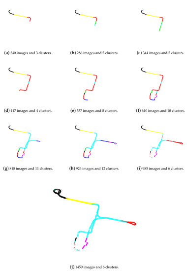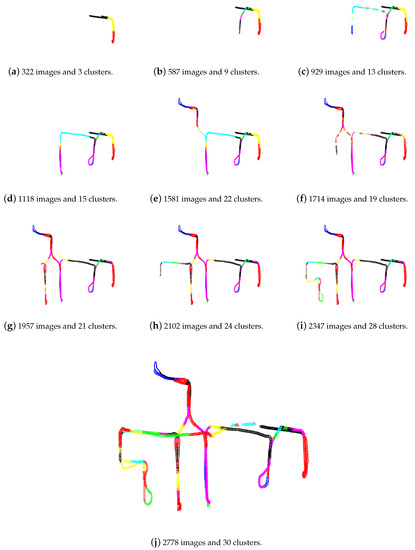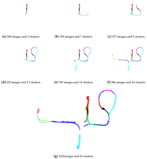 Figure 13, Figure 14 and Figure 15 show a bird’s eye view of the capture points of the three datasets in different points of the proposed incremental clustering process. These capture points are shown with different shapes and colors, depending on the cluster they belong to. Figure 13j, Figure 14g and Figure 15j show the result after completing all the proposed incremental mapping method, and the subfigures show how the clusters are being created while the map is updated. Observing the pairs of subfigures: Figure 13c,d,f,g or Figure 15e,f it is possible to see how node merging (Section 4.6) works. Initially, there are several clusters and after including some new images and creating new clusters or making a specific cluster larger, it is possible to obtain similar clusters, so the merging process is launched and it results in a lower number of clusters. Finally, Figure 14b,e shows how transition between rooms resulted in an increased number of clusters. After 399 images, the process has detected 7 clusters but from moment Figure 14e to the end of the process the robot has moved across a long corridor and only changes the room once, for that reason only 2 clusters are created on that process. Others characteristics such as loop closure can be observed in the figures.