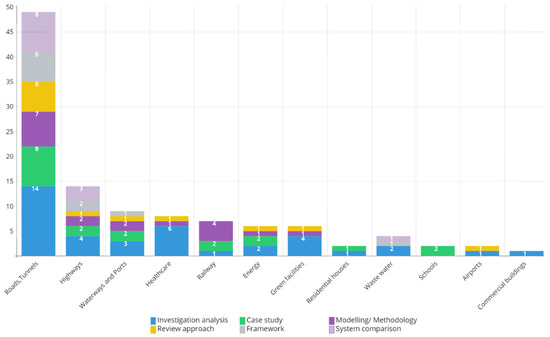 Eighty-five of the selected research papers referred to multiple PPP infrastructure projects. The remaining articles were concerned with different construction types. As shown in Figure 1, over 23% of the road and tunnel work was conducted using a PPP procurement model, which was a relatively low proportion. With respect to the research outcomes, the literature that was focused on “investigation and analysis” produced a high volume of work; there were 72 different infrastructure subjects. There was also extensive works focusing on the most common research themes, which were project case studies, methodology development, framework, and review approaches.