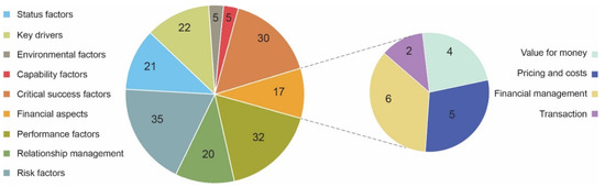 Figure 2 represents the distribution of the research articles that stressed different important factors or dimensions in the PPP infrastructure. Literature concerning “risk factors” (35), which referred to risk indication and allocation schema, “performance factors” (32) related to project performance measurement, and “critical success factors” (CSF) were found in high proportions. Other emerging areas included the leveraging of business models to stress the PPP implementation status (21) and relationship management (20). Specifically, with respect to finances, the underdevelopment of the VfM assessment was indicated (4). This was due to most literature on financial management not involving the structure or official body defined in VfM nor any to links to measurement issues. The papers refer to VfM assessments that are mainly investigation and analysis and literature review-based research. For example, Henjewele et al. [10] proposed to use empirical studies to investigate the variations in PPP transport sectors that influenced the VfM assessment and found that the current assessment was often carried out with considerable uncertainty in costs estimates and requirements.