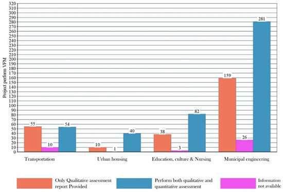 Based on the VfM performance in the engineering project domain (e.g., transportation, urban housing, education, culture, nursing, and municipal engineering), using the PPP project library of the China Public-Private Partnerships Centre, the VfM reports of each project were collected and analysed. As shown in Figure 3, a considerable number of projects did not provide an appropriate quantitative assessment. This indicates that the VfM, which is regarded as essential, still lacks completeness with respect to implementation. As for the project with the VfM report document, the author also investigated the report in detail and determined that the data processing was inaccurate. The presentation of the qualitative assessment, its content, and how managers scored the related factors were also problematic in most PPP projects. More detailed explanations and measurement approaches are required to enhance the level of the quantitative performance. The qualitative process was conducted in an excessively simple form, while the quantitative method was frequently abrogated or postponed due to feasibility issues [24].