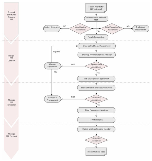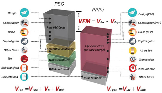 The definitions of VfM given by the UK Government and the World Bank Group describe the optimum combination of whole-of-life costs and quality [25]. The criteria specify that, among other factors, business incentives within the procurement process could be integrated into a performance benchmarking process, as an initial reference [26]. As things currently stand, the VfM process is a subjective matter. There are now toolkits and measurement lists to provide guidance on PPP in comparing the actual outcomes of alternative procurement options. In the appraising and structuring stage of PPP, the analysis of VfM is made under the evaluation directory, with project feasibility, commercial viability, and risk indication and allocation. Compared with other assessment processes in PPP, these drivers of the VfM include most of the elements mentioned above, such as the project feasibility and commercial viability. This makes the VfM process more comprehensive. The VfM does not merely rely upon the whole life costs of the assets, which are regarded as an early stage quantitative assessment, but it is also viewed in terms of the project’s ability to achieve a high level of performance. Thus, the VfM is judged by assessing every aspect and element of the project quality [25].