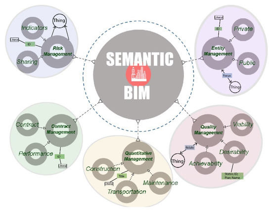 The semantic web represents explicit domain knowledge that could be related to the built environment. That information is initialised by human knowledge-oriented language and linked to multiple domain knowledge bases [58]. As an integral component of the semantic web, ontology plays a significant role, since it structures the implementation framework that could be made readable by computer language applications. Ontology web language (OWL), the language of expression, has been given rule-based functions to query information from a different knowledge base and then provide the path for data management [59]. An ontological representation allows sophisticated knowledge to be incorporated into a project system that is implemented logically [60]. Unlike general object-oriented programming models in software development that enable the model’s transformation into software artefacts, a model in an ontological environment contains semantic relationships, domain knowledge annotation, and rich rules for information management [61].