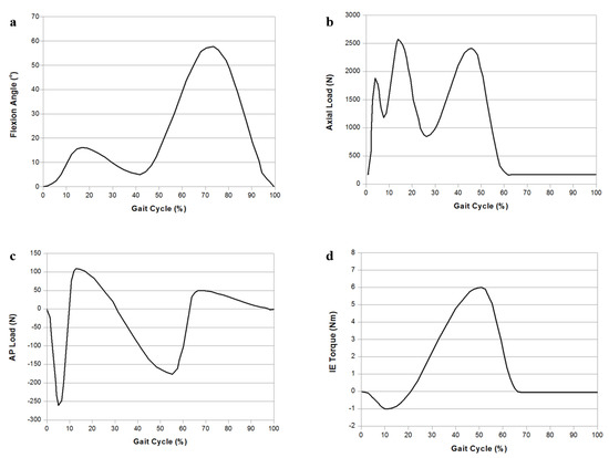 Input function of the gait cycle applied in the study: (a) flexion angle; (b) axial load, (c) anterior-posterior (AP) load; (d) internal-external (IE) torque.