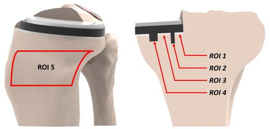 For model predictions and validation for clinically relevant loading scenarios, three different loading conditions related to the loads applied in the experimental research were applied to this FE study. Identically simulated loading protocols were used in the experiment for validation of the model. Under the first loading condition, 150 N was applied to the tibia with 30° and 90° flexion in the knee joint to evaluate the anterior and posterior tibial translations [23]. Under the second loading condition, an axial load of 1150 N was applied on the FE model to obtain the contact stresses and to compare them with those reported in a published FE study on the knee joint [27]. Under the third loading condition, UKA model validation was conducted with four flexion angles (0°, 30°, 60°, and 90°) using passive flexion simulation. Furthermore, anterior and posterior drawer loads of 130 N were applied separately to the tibia at the center of the knee, equivalent to the conditions in experimental research [43]. As a fourth loading condition, gait cycle loading was applied to compare the biomechanical effects of the three different tibial bearing materials (Figure 2) [44]. A computational analysis was performed using force controls of the anterior–posterior force in regard to the compressive load applied to the hip [45,46]. A proportional–integral–derivative controller was integrated into the computational model to allow for the control of the quadriceps in a manner equivalent to that in the experiment [47]. Internal–external and varus–valgus torques were applied to the tibia [45,46]. The contact stresses on the lateral meniscus and tibial cartilage were analyzed in the other compartments, as well as tibial bone stress, influencing residual pain. Five regions of interest (ROIs) were defined on the proximal tibia (Figure 3). ROIs 1 and 4 were defined at the resection corner between the sagittal and transverse tibia bone cuts. The other three ROIs were located on the trabecular bone surface beneath the tibial baseplate, with ROIs 2 and 3 being medial and lateral to the keel slot, respectively. ROI 5 was defined to investigate the cause of residual pain and was positioned on the proximal anteromedial surface of cortical bone for all models.