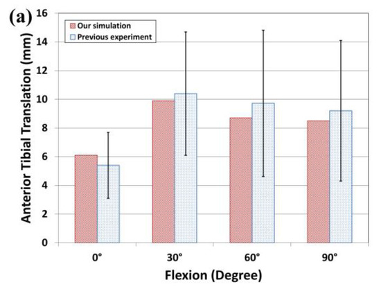 The FE model was subjected to evaluations based on experimental data available in the literature. The intact model validation was conducted in a previous study [22,23] and is briefly introduced herein. Mesh convergence was defined as the point at which cartilage pressures were within 95% of the pressure of the next two smaller mesh sizes. This criterion was met by a mesh size of 2.0 mm. If the differences between FE model simulations and experimental data were lower than two standard deviations (SDs) from the mean of the experimental data, the FE model was considered to be validated. This was explained with an in vivo laxity test for the subject identical to the FE model. The laxity test was applied to the anterior–posterior drawer under 30° and 90° of flexion with a series of stress radiographs. Its results were compared with the results from the experiment on the FE model’s subject to validate the intact FE model. Under the loading condition with 30° flexion, the anterior tibial translation was measured as 2.83 mm in the experiment and 2.54 mm in the FE model, and the posterior tibial translation was measured as 2.12 mm in the experiment and 2.18 mm in the FE model for validation [23]. A good agreement was thus shown between the experiment results and the FE model. In addition, the results were also compared with previous FE results for validation. Under an axial load of 1150 N, average contact pressures of 3.1 and 1.53 MPa were evaluated on the medial and lateral meniscus, respectively. Both contact pressures were within 4% of the equivalent pressures of 2.9 and 1.45 MPa reported by Pena et al. [27]. These minor differences might have been due to variations in the geometries, such as the thickness of the cartilage and meniscus, between different studies. However, on an overall basis, the high consistency between the results of the validation and reference substantiated the FE model’s ability to produce reasonable results [27]. The UKA model validation was performed through the use of anterior and posterior translations of tibial compartments in the anterior and posterior drawer tests at 134 N for 6.1, 9.9, 8.7, and 8.5 mm; and 5.8, 4.3, 3.8, and 4.9 mm at 0°, 30°, 60°, and 90° knee flexion in the UKA model, respectively (Figure 4). These findings from the simulation indicate good agreement with prior experimental data within the ranges of values under the anterior and posterior drawer loads [43].