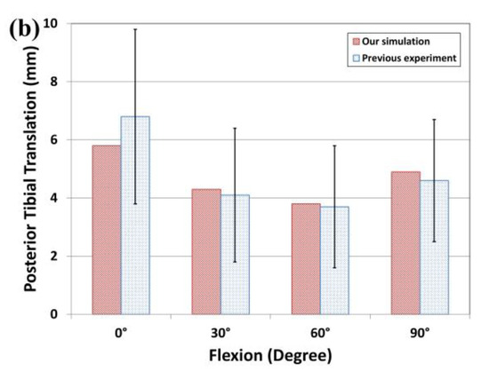 Comparison of validations between the UKA model and a previous experimental study: (a) anterior tibial translation; (b) posterior tibial translation.