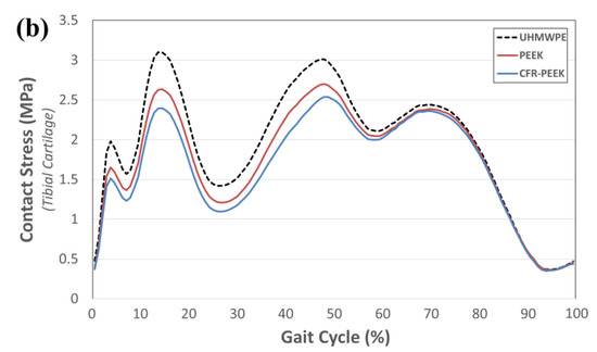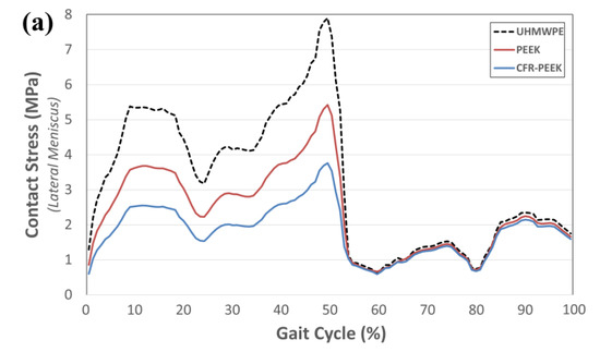 We found that the lowest contact stress occurred on the lateral meniscus and tibial cartilage when using CFR-PEEK. In addition, the greatest contact stress was found during the stance phase, during which an axial force occurred. This trend was equivalent to those found in previous research [26,58]. Because the contact stress is mainly affected by compressive loading, during the swing phase, where there is no compressive load, no difference was observed in the contact stress with the change in material. In addition, the difference in contact stress for the different materials was greater in the lateral meniscus than in the articular cartilage, which is due to the anatomical difference between the lateral meniscus and tibial cartilage. A meniscus is a bumper for an articular surface, equivalent to a bearing; therefore, there is a greater difference in the lateral meniscus with respect to the change in material.
