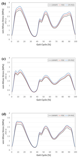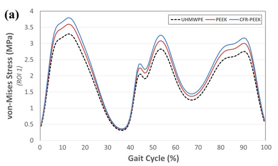 Figure 6 indicates the von Mises stress in the tibial bone ROIs with respect to the tibial bearing materials UHMWPE, PEEK, and CFR-PEEK during the gait cycle. ROIs 1 and 2 showed the greatest stress in the trabecular bone regions, ROIs 1–4, in all three models, and it was found to occur during the stance phase. However, unlike the contact stress, there was a difference in stress in regard to the different tibial bearing materials during the gait cycle. In the trabecular bone region, PEEK and CFR-PEEK showed greater stress, but they showed lower stress than the UHMWPE model in the cortical bone region, ROI 5.