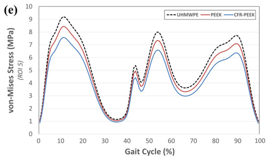 Comparison of von Mises stress in ROIs 1–5 with respect to different tibial bearing materials during the gait cycle: (a) ROI 1; (b) ROI 2; (c) ROI 3; (d) ROI 4; (e) ROI 5.