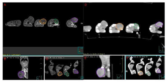 Female BALB/c mice (n = 5; 8 weeks old; 18–20 g) were purchased from Jackson Laboratory (Bar Harbor, ME, USA) and were housed at 22 ± 5 °C in a 12 h light/dark cycle and fed rodent chow and water freely. Mice were subcutaneously inoculated with 25 µL 4T1 cell suspension (1 × 104) under 2% isoflurane. The skin was tented up, and the 4T1 cells were implanted under the skin in the dorsal right flank regions. Tumor length (L) and width (W) were measured every week using digital calipers. Tumor volume (V) was calculated as [V = (L × W2)/2]. After tumor volumes reached ~200 mm3, animals were CT- and MRI-imaged, and tumors were outlined as depicted in Figure 1.