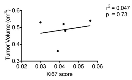 These data indicate that there is no obvious correlation between tumor volumes and measured proliferating tumor cells. The estimated value for the Pearson correlation coefficient is 0.047, confirming the lack of linear dependence between tumor volume and Ki-67. At the same time, tumor volumes are surrogates for a response to treatment. The Ki67 staining score is strongly associated with cell proliferation, and it is used very commonly in routine histopathology (Figure 2).