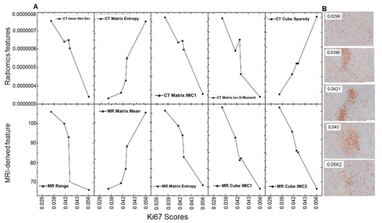 Dependence of five CT (A top row) and five MRI (A bottom row) radiomics features on post-treatment histochemistry proliferation marker Ki-67. The CT features (A top row) are mean absolute deviation 3D, cube IMC1, matrix IMC1, matrix inverse difference moment, and cube sparsity. The MRI features (bottom row) are mean absolute deviation 3D, matrix mean, matrix entropy, cube IMC1, and cube IMC2. Also, (B) the column on the right contains the histology slides with Ki-67 values denoted in the top left corner of each slide. The Ki-67 increases from top to bottom, as can be observed from the increasing amount of red-brown stain on the slides.
