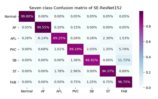 Table 1 is that the F1 scores of our model for AFL, PVC, SB and FAB were relatively lower than the F1 scores for Normal, AF and ST. Furthermore, to analyze the results in more detail, we selected the 152-layer SE-ResNet models with the highest F1 scores for the seven-class classifications. We calculated the confusion matrices of these models, and they are graphically shown in