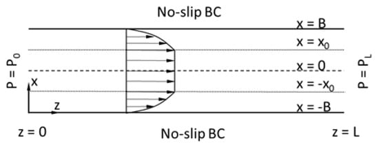 Byron–Bird [] derived analytical solutions for the Bingham flow in a channel, driven by a pressure gradient . The channel was depicted as the length and the width . The no-slip boundary condition was applied to the surfaces of the channel (Figure 1).