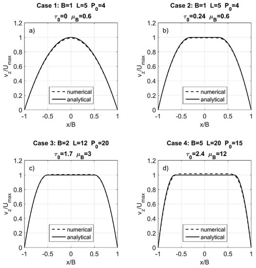 Four cases were proposed to validate the models with Equations (13) and (14). They are one Newtonian case and three Bingham cases with different parameters such as channel length , channel width , one end’s pressure , Bingham viscosity , and yield stress . Figure 2 shows good agreements between the theoretical and numerical results of the all runs. One of the important features of a Bingham fluid is the plug zone (Figure 2b–d), which cannot be seen in the Newtonian fluid (Figure 2a). Note that the velocity of a Bingham fluid is constant in the plug region. In this region, the rate of change of velocity (strain rate) is equal to zero. In the liquefied region, the strain rate is greater than zero and the stress–strain relation of the fluid is dependent on the plastic viscosity . These figures demonstrate that the present numerical model can accurately describe the rheological behavior of Bingham fluids.