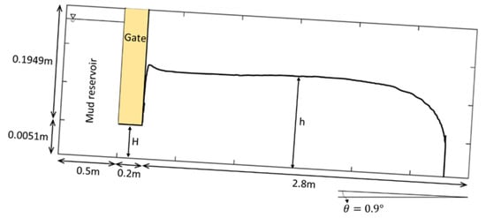 The validation of the spreading of Bingham fluid on an inclined plane is set up based on the experiment of Liu []. Kaolinite was mixed with tap water to represent the mud. The mud was put in a reservoir. When the adjustable gate was opened, the mud flowed down onto an inclined dry bed with the inclined angle . In this validation case, the openness of the gate was m. The fluid density kg m−3, the yield stress, Pa, the viscosity of the plug zone, Pa s, the viscosity of liquefied zone, Pa s. A two-dimensional numerical domain was set up as 3.5 × 0.2 m (Figure 3) and was discretized into a regular mesh with grid size dx = 2.3, dz = 2.0 mm. Figure 4a shows the spreading of mud on an inclined plane versus time. Figure 4b shows that the numerical result of Bingham model matches well with the theoretical solution as well as the experimental data from Liu []. The mudflow develops into a self-similar front when time t > 8.0 s. Because of the yield stress, the free surface needs not to be horizontal when the mud fluid is in static equilibrium, nor parallel to the plane bed when it reaches a steady-state. The mud front, like a steady gravity current, eventually advances at a constant speed with the same profile when there is a steady upstream discharge of mud []. The numerical results present a similar pattern of analytical solutions to that in Liu [].