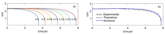 The free-surface profiles of Bingham flow on an inclined plane. (a) Snapshots (unit: s); (b) validation at t = 14 s. The experimental data and theoretical results are obtained from Liu []. The numerical results are simulated by the Bingham model.