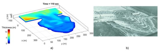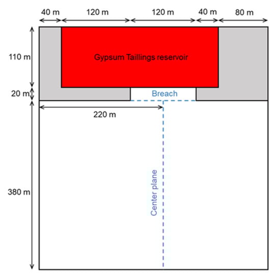 The present numerical model was applied to simulating the failure of the gypsum tailings dam in East Texas in 1966 (FGT66). The reservoir was a rectangular shape and reached a height of 11 m when the failure took place. The slide was triggered by seepage at the toe of the embankment. An estimated 80,000–130,000 m3 of gypsum was released in this flow failure. The released material traveled about 300 m before it came to a stoppage, with an average velocity of 2.5–5.0 m/s []. In this paper, the numerical setup was composed based on the geometry reported by Jeyapalan [], shown in Figure 5. The size of the tailings reservoir was 280 × 110 × 11 m, and the breach was 120 m long. The center cross-section of the breach was located at y = 220 m. The computational domain (510 in length, 400 in width, and 12 m in height) was discretized into a uniform mesh with a grid size dx = 2.0, dy = 2.0, dz = 1.0 m. The number of the grid was 612,000. The bottom boundary (at z = 0 m) was a no-slip boundary condition. The downstream (x = 400 m) and lateral boundaries (y = 0 and y = 400 m) were free-slip walls. The downstream and lateral boundaries would not affect the simulation results because the domain was set to be much larger than the predicted tailing pattern. The gypsum tailings material was expected as a Bingham material. Based on the parameters reported by Jeyapalan [], Pastor [], and Chen [], the yield stress of the tailings was Pa, the viscosity of the liquefied zone was Pa s, and the density was kg m−3. The viscosity of the plug zone was suggested to be infinite (e.g., Pa s) by Assier Rzadkiewicz [], Taibi [], and Yu [].