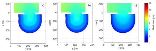 In this model, the yield stress and yield viscosity of the mud material are exponentially dependent on material concentration []. The detailed descriptions are added in Section 5.2. To present the un-yield behavior, is chosen to be infinite based on the suggestions of Assier Rzadkiewicz [], Taibi [], and Yu []. In this paper, the infinite number of viscosity Pa s is chosen by the sensitivity analysis. The values of yield strain rate are also discussed in Section 5.2. s−1 is adopted by a sensitivity analysis to illustrate the deformation in MBM.