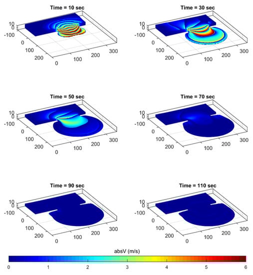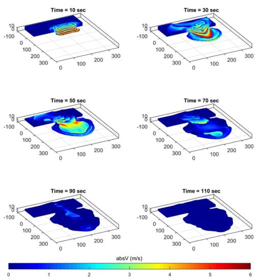 Figure 8 and Figure 9 show the time evolution of the free-surface velocity of the mudflows from t = 0~110 s by using BM and MBM, respectively. The velocity at the early stage (about t = 0~10 s) of BM was higher than that of MBM. However, the simulated mudflow in BM stopped earlier (around 70–90 s). The surface velocity gradually approached zero from t = 70 s, and the flow came to a full stop at t = 90 s. The gypsum tailings distance was around 220 m, and the mean velocity was around 2.4–3.1 m s−1 as shown in Figure 8. On the other hand, the flood distance from MBM was 310 m which was much closer to the field observation of 300 m []. The larger un-yield viscosity and yield strain rate limited the flood velocity at the early stage of the event (Figure 9). The mud started to liquefy and collapse in a small region near the breach in the first 10 s. The spreading shape of the tailings was symmetric along the centerline of the breach during t = 0–20 s. Because the supply of the tailings from the impoundment was asymmetric, the spreading shape gradually became asymmetric when t > 20 s. The maximum velocity of the released tailings occurred at t = 30 s. Then, the flow velocity gradually decreased. After t = 90 s, the tailings slowed down and stopped moving at t = 110 s. The mean velocity of the tailings flow was estimated at around 2.8–3.4 m s−1.