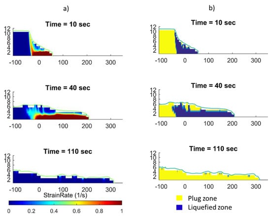 Snapshots on the centerline cross-section of the breach (y = 220 m) predicted by MBM. (a) The profiles of strain rate. The color bar is set from 0.0 to 1.0 s−1 to emphasize the interface between the plug zone and liquefied zone at s−1. (b) The discontinuity of the plug zone and liquefied zone.