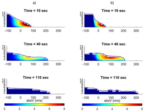 Snapshots of velocity magnitude on the centerline cross-section of the breach (y = 220 m) (a) Bingham model (BM); (b) modified bi-viscosity model (MBM).