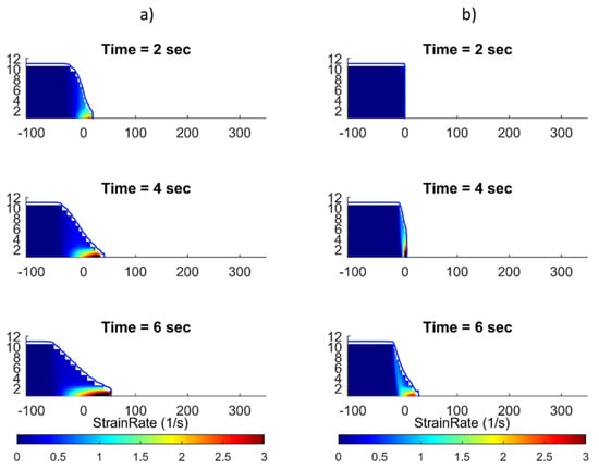 Figure 13 shows the strain rate profiles of BM and MBM. The slip surface (Figure 13b) at t = 10 s) and the interface between the plug/sheared zones (Figure 13b) at t = 40 s can be identified in the results of MBM. The slip surface was relatively sharp in the MBM results compared to the ones in MB (Figure 13a).