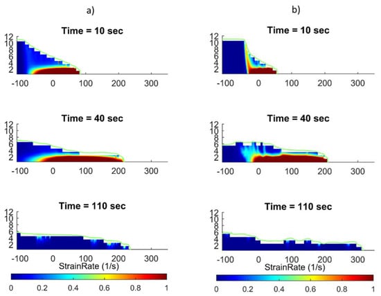 Snapshots of strain rate profile on the centerline cross-section of the breach (y = 220 m). (a) Bingham model (BM); (b) modified bi-viscosity model (MBM).