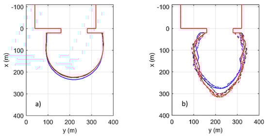 The stoppage boundary profiles of FGT66 for grid resolution analysis. (a) Bingham model (BM); (b) modified bi-viscosity model (MBM). Red lines: dz = 0.8; black lines: dz = 1.0; blue lines: dz = 1.2; solid lines: dx = dy = 1.8; dashed lines: dx = dy = 2.0; dash–dot lines: dx = dy = 2.2.