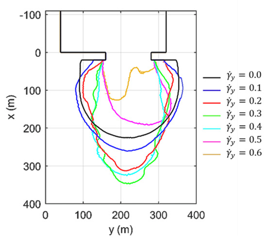 The stoppage boundary profiles of FGT66 predicted by the modified bi-viscosity model (MBM) for sensitivity analysis of yield strain rate (unit: s−1).