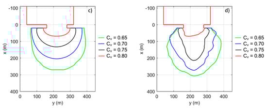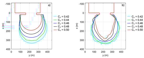 Rheological properties of hyper-concentration are generally formulated as a function of the fluid concentration. Julien [] recommended empirical formulas with the exponential relationships for yield stress and viscosity at large concentrations of fines. The typical values of coefficients for different types of mud, clay, and lahar are presented in Table 2. Kaolinite and Typical soils are utilized to describe the features of BM and MBM in this section. Eighteen numerical cases, including nine Bingham cases and nine modified Bi-viscosity cases with different concentration are performed. The yield shear stress and the viscosity are presented in Table 3. The yield strain rate is specified as s−1 for the Bingham cases and s−1 for the modified Bi-viscosity cases. The goal of this analysis is to find a material, which has a similar property to the tailings in FGT66. A similar inundation profile is the key. Figure 16 shows the simulation results with different concentration by BM and MBM. The deposited boundary of Kaolinite at (red line in Figure 16b) has the best fit to the MBM result of FGT66 (red line in Figure 15). It is due to the similarity of between two materials: Kaolinite Pa and the gypsum tailings Pa.