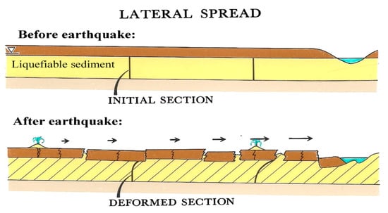 Liquefaction is a relevant soil phenomenon for geotechnical design as it may cause local or global failures of foundations and even the collapse of complete structures (Jia (2017) []). Among the potential consequences of soil liquefaction, one of the most dangerous ones is lateral spreading. Youd (2018) [] defined this phenomenon as the horizontal displacement of a soil layer riding on liquefied soil either down a gentle slope or toward a free face like a river channel (Figure 2). When the underlying soil layer liquefies, the non-liquefied upper soil crust continues moving down until it reaches a new equilibrium position. Figure 3 shows two recent examples of liquefaction-induced lateral spreading: (1) west levee of the Westside Main Canal in the 2010 Sierra El Mayor Mw 7.1 earthquake, where a cumulative horizontal displacement of more than 1 m was observed (Figure 3a), and (2) the Muzoi Bridge in the 2005 Nias Island Mw 8.6 earthquake, where a lateral movement of more than 4 m towards the river on both sides of the bridge was reported (Figure 3b).