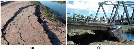 Historical cases of lateral spread: (a) lateral spread ground failure near the west levee of Westside Main Canal in the 2010 Sierra El Mayor Mw7.1 earthquake (photo taken by John Tinsley on 4/7/10, Mccrick et al. (2011) []); (b) lateral spread affecting the piers of the Muzoi Bridge in the 2005 Nias Island Mw 8.6 earthquake (modified from Aydan et al. (2005) []).
