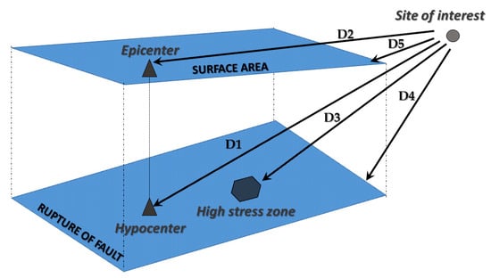Distances from an earthquake source to the site of interest (adapted from Joyner and Boore (1988) []).