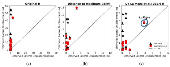 Observed versus estimated lateral displacements using: (a) original R-value from Youd et al.‘s (2002) equation, (b) distance to the maximum uplift, and (c) distance adopted by De la Maza et al. (2017) [].