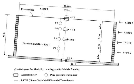 The project Verification of Liquefaction Analysis by Centrifuge Studies (VELACS) was a cooperative research effort involving eight universities to study soil liquefaction problems (Arulanandan and Scott (1993) []). In that project, a series of dynamic centrifuge tests was performed on a variety of different saturated soil models (Arulanandan and Scott (1993) []). In this section, we present the simulation of the centrifuge model 2 of the VELACS project conducted at Rennselaer Polytechnic Institute (RPI) by Taboada and Dobry (1998) [] and numerically validated by Elgamal et al. (2002) []. In this test, the soil profile consisted of submerged 20 cm high (physical model) uniform Nevada sand, of Dr = 40%–45%, inclined by 2° with respect to the horizontal (more details in Table 4). The experiment was conducted at 50 g centrifugal acceleration. A sketch of the laminar box and the instrumentation is shown in Figure 7. The lateral input shaking applied to the base of the model and its corresponding 5% damped pseudo acceleration response spectra are shown in Figure 8.