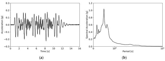 (a) Lateral acceleration at the base of the laminar box of VELACS model 2 (Elgamal et al. (2002) []) (b) 5%-damped spectral acceleration at the base of the laminar box of VELACS model 2.