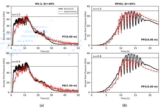 Numerical versus experimental excess pore pressure in (a) M2-2 and (b) RPI-02 at two different depths.