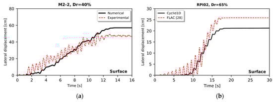 (a) Numerical and experimental lateral displacement at the surface in M2-2, and (b) numerical displacement in RPI-02 with Cyclid1D simulation and Fast Lagrangian Analysis of Continua, FLAC (Ziotopoulou (2018) []).