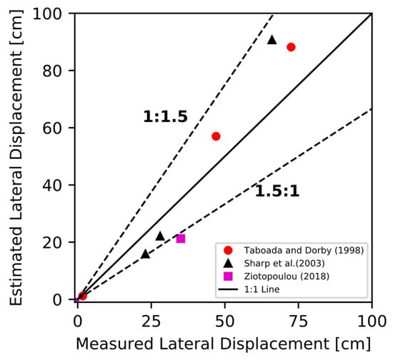 Most of the lateral spreading prediction models are empirical. They use regression procedures to fit equations with field case histories (Hamada et al. (1987) [], Bartlett and Youd (1995) [], Youd et al. (2002) []). These models take different algebraic forms, and they rely on parameters such as the liquefiable soil’s thickness, density, and fines content; earthquake magnitude; and site-to-source distance. Semi-empirical models (Zhang et al. (2004) []; Faris et al. (2006) []) use other variables, like shear strain ratios and earthquake intensity measures, such as peak surface acceleration. Table 1 shows a list of existing lateral spreading prediction models and their main variables.