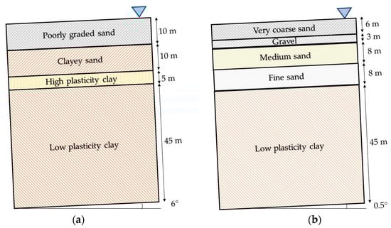 For the Matanuska site, the modeling section was developed considering the boreholes taken at the Railroad Bridge Mile Post near the Matanuska River (Bartlett and Youd (1992) []). According to Gillins and Bartlett (2014) [] the selected soil profile was composed, from top to bottom, of gravel sand (~6 m thick), well-graded gravel (~2 m thick), poorly graded sand (~5 m thick), clayed sand (~9 m thick), and low plasticity clay (down to 70 m deep before a highly cemented soil). Table 7 shows the parameters used in the Matanuska model. Figure 15 shows the soil geotechnical layout at both sites.