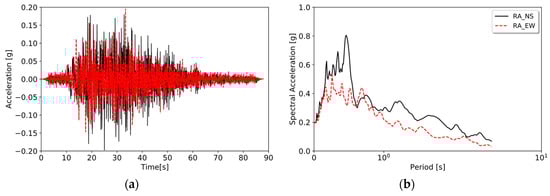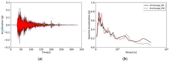 The 1964 Alaska Mw 9.2 earthquake caused ground failures and collapsing structures from lateral spreading, and the associated tsunami caused about 130 deaths (Bartlett and Youd (1995) []). According to Mavroeidis et al. (2008) [], no strong motion instruments were operative when that destructive seismic event occurred, so no direct measurement of near field ground motions are available. Consequently, we used a simulated ground motion at the Anchorage site shared by Mavroeidis et al. (2008) [] to reproduce the lateral spreading case. Figure 17 shows the simulated record (both directions) with a significant duration of approximately 152 s and a PGA of 0.25 g.
