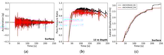 Numerical modeling results using both simulated horizontal motions in Anchorage. (a) horizontal acceleration at the surface, (b) excess pressure pore ratio at a 13 m depth, and (c) lateral displacement at the surface.