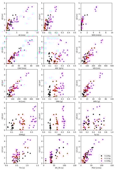 The coefficient of determination (R2), the Pearson correlation coefficient (ρ), and the Spearman rank correlation coefficient (rs) were used to quantify the correlation between lateral displacements at the surface (LD) and intensity measurements. These correlation coefficients can range from −1 to +1, where −1 means total negative correlation, 0 means no correlation, and +1 means total positive correlation. As Table 9 shows, the most influential parameters were CAV = cumulative absolute velocity (R2 = 0.87, ρ = 0.93, rs = 0.88), HI = Housner intensity (R2 = 0.78, ρ = 0.88, rs = 0.79) and SMV = Sustained Maximum Velocity (R2 = 0.78, ρ = 0.88, rs = 0.79). In this case, the three coefficients are the highest. On the other hand, the least influential parameters were Tp = predominant period (R2 = 0.01, ρ = −0.05, rs = 0.17) and DRMS = root-mean-square displacement (R2 = 0.01, ρ = −0.02, rs = 0.06).