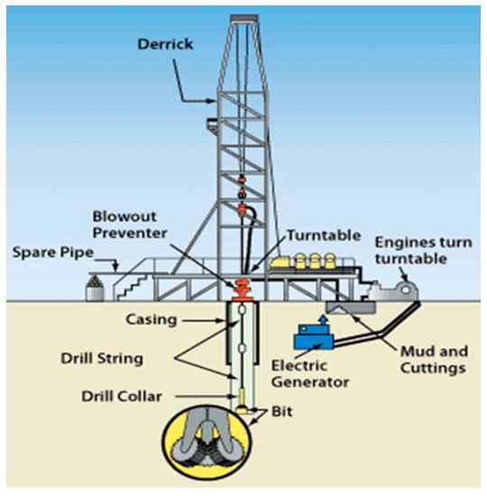 Drilling systems are designed to make a link between the surface of the earth and the deposit that may contain gas and oil reserves. This connection is carried out in the form of a hole from the surface to a certain depth. There are several types of drilling systems, but the most efficient and widespread is the rotary drilling system (Figure 1). Its operating principle is based on the fact of rotating a system while applying weight on its bottom from the top, so that drilling can proceed. It is mandatory to have a draw winch which aims at suspending the drillstring through a crown block and a traveling block with a hook at its end [14]. The set of draw works, crown block, traveling block, and hook, can apply the necessary weight on the drill bit (WOB).