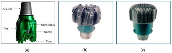 Types of drill bit: (a) bit anatomy, (b) matrix body of PDC bit, (c) natural diamond tricone bit.
