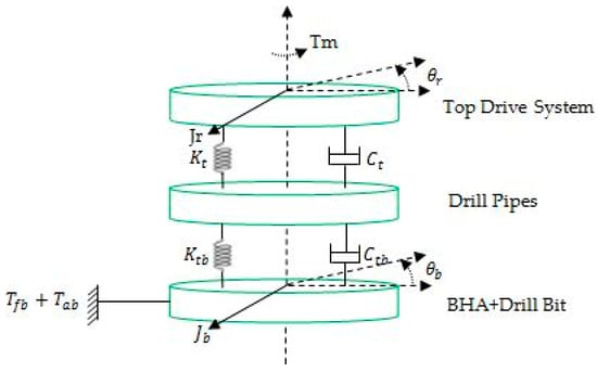 The interaction of the drilling mud with the drillstring can be simplified in the form of viscous damping and along the drill pipes and the BHA, respectively. It is assumed that the top drive rotates with an initial velocity and provides a torque Tm (with neglecting the damping and frictional torques at the top drive). According to the fundamental principle of the rotational dynamics