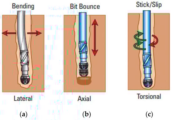 The type of drilling itself may cause oscillations, for example in the rotary drilling systems; it only takes small self-excited disturbances to put the drillstring in an unstable oscillating regime. Drillstring vibrations lead to harmful consequences, several studies have been carried out in this context, i.e., reduction in drillstring components virtual life [18], premature wear of components [19], decrease in penetration rate [20], increased costs and expenses [21]. Usually, vibrations are classified according to the direction in which they occur, for this purpose, three vibration modes can be identified: axial vibration, lateral vibration, and torsional vibration; but in reality, it is very rare to find vibrations in a single mode, they are always synchronized in coupled modes (torsional–axial or torsional–lateral).