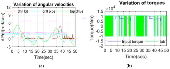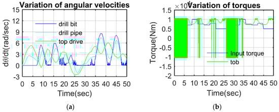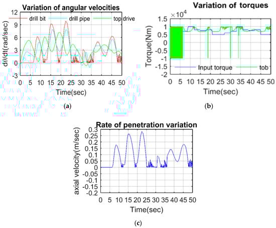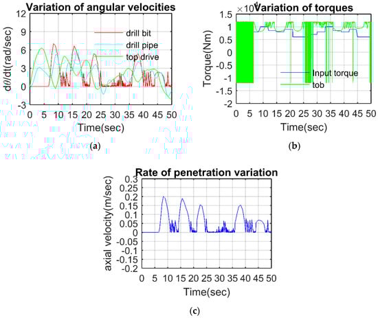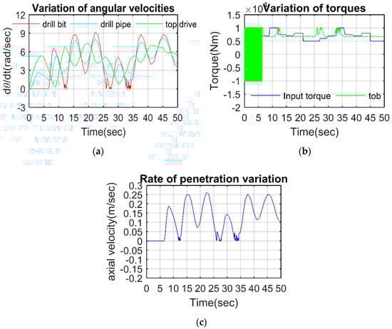 In the first scenario, the stick-slip appears during the whole simulation time, the bit is almost stuck in the time interval (25, 30 s) (Figure 8a). This time corresponds to low values of input torque (Figure 8b). Indeed, low values of top torque increase the sticking phase time. For high values of input torque, the angular velocity of bit becomes greater than the top velocity, the period of sticking phase decreases and significant torsional oscillations are observed. Moreover, stick-slip vibrations have slowed down the rate of penetration (Figure 8c).